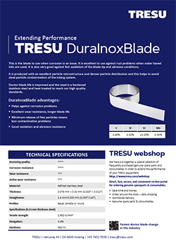 This is the blade to use when corrosion is an issue. It is excellent to use against rust problems when water based inks are used. It is also very good against fast oxidation of the blade tip and abrasive conditions. It is produced with an excellent particle microstructure and denser particle distribution and this helps to avoid steel particle contamination of the inking system. Doctor blade life is improved and the steel is a hardened stainless steel and heat treated to reach our high quality standards.